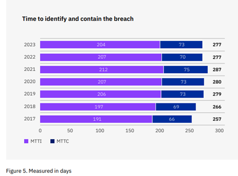 El informe nos revela que el tiempo medio para identificar y contener una brecha de ciberseguridad no está en el entorno de pocos días o semanas, sino que actualmente es de 277 días, es decir, más de 9 meses para que una organización pueda detectar que fue vulnerada y mitigar los efectos.