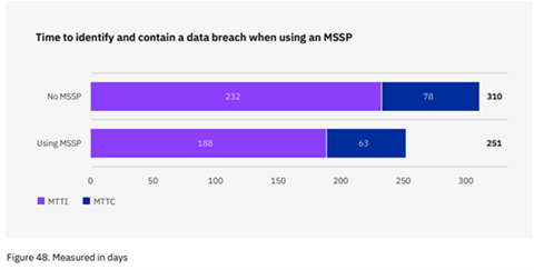 En primera instancia, el gráfico indica que una organización que trabaja con un Proveedor de Servicios Gestionados de Seguridad (MSSP) reduce de manera significativa los plazos involucrados en la gestión del incidente.