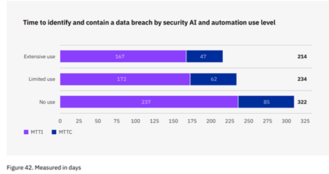 Identificar y contener una brecha con uso de IA de seguridad y automatización tomó solo el 66% del tiempo que les llevó a las organizaciones sin su uso.