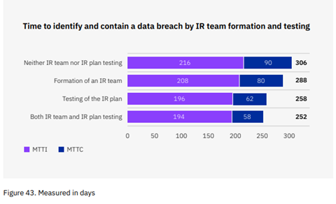 La estrategia dual de formar un equipo de IR y probar un plan de IR demostró un tiempo más corto, 252 días, para identificar y contener una violación de datos en comparación con 306 días de no emplear ningún enfoque, una diferencia de 54 días o 19,4%. Probar el plan de IR sin formar un equipo fue casi igual de efectivo, lo que resultó en una diferencia de 48 días o 17%.